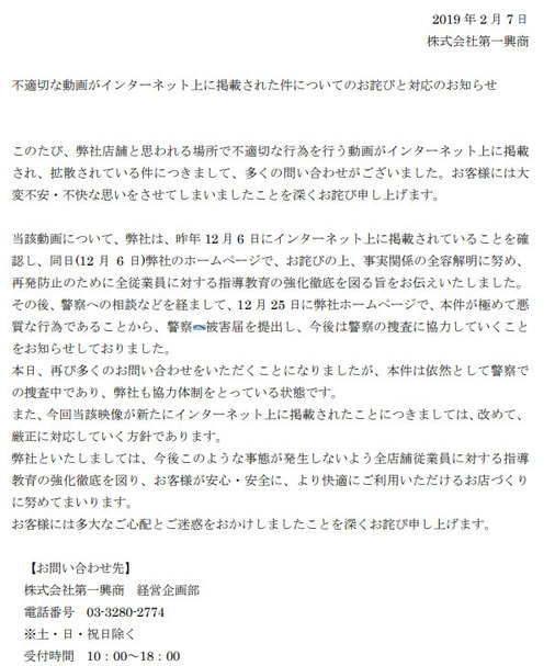 しかし、当該動画が再拡散されるようになり、2019年2月7日になって同社に再び多くの問い合わせがあったとのこと。現在も、警察での捜査中で、同社も協力体制をとっている状態でとのこと。また、今回当該映像が新たにインターネット上に掲載されたことについても、改めて、厳正に対応していく方針としています。